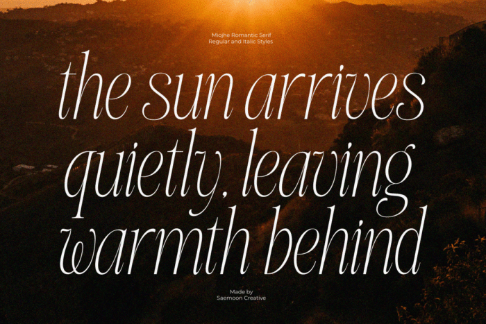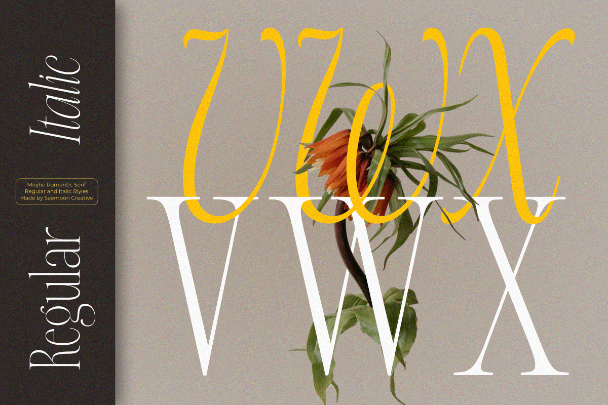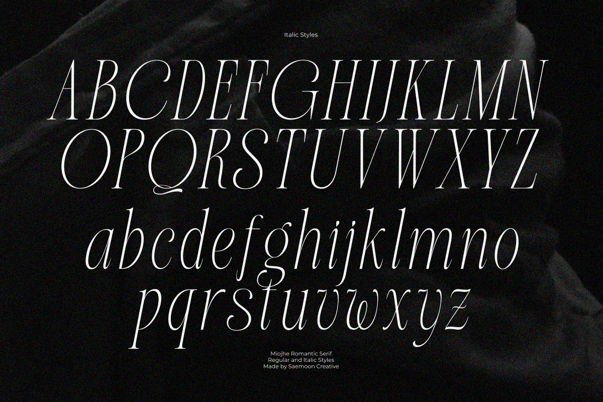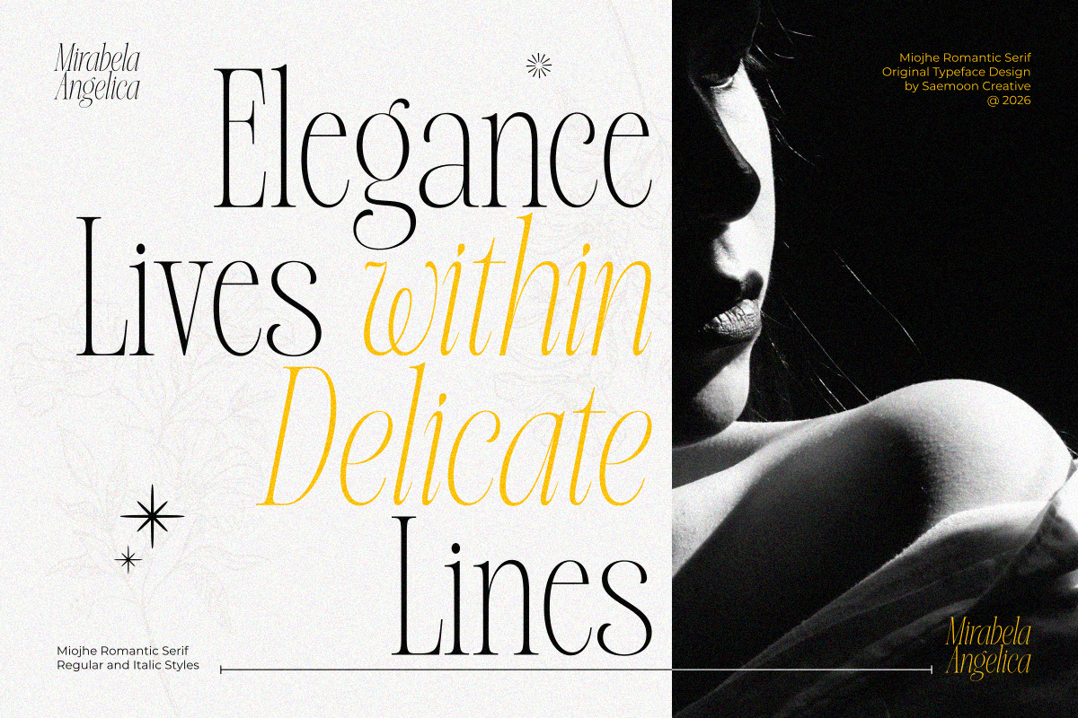 Miojhe – Romantic Serif is an elegant serif typeface that carries a romantic, gentle, and timeless character. Crafted with refined contrasts and graceful curves, Miojhe brings a soft sense of luxury and emotional depth to every design.