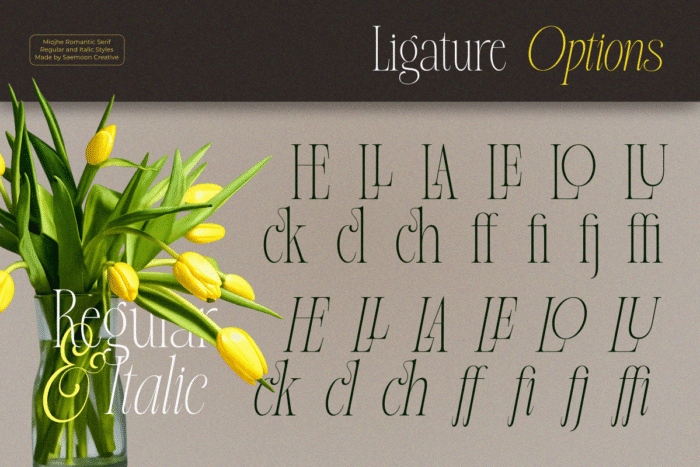 Designed to support rich and expressive layouts, Miojhe is equipped with carefully crafted ligatures that add a natural flow and subtle uniqueness to your typography. These ligatures help create a more personal and refined visual rhythm, making your designs feel alive and thoughtfully composed.